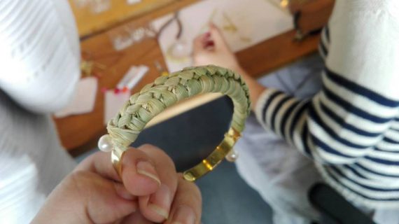 京都は左京区の、山深い花背という地域で、実際に自ら稲を育て、藁をつくり、藁細工を守り伝える彼女は、花背WARAを立ち上げました。藁細工ジュエリーのブランドです。今回、藤井さんが、尾道で藁について語り、実際に手を動かして、技術を伝えてくださいました。