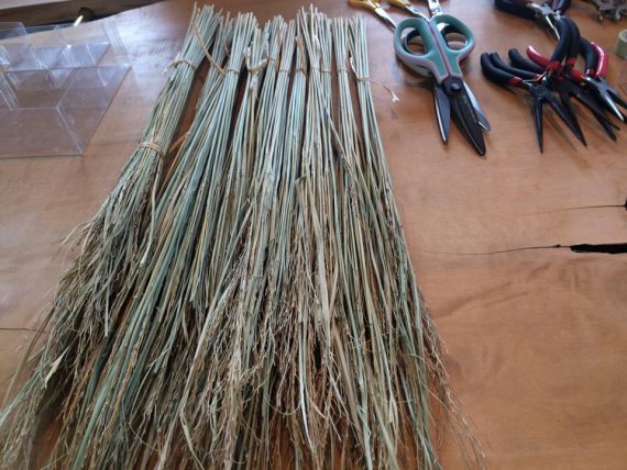 このことは、いぐさ部活動を通して気付いたことでもありますが、ついつい忘れがちで、私たちが考えついた、発見した、編み出した(編んでるだけに)などという態度を取ってしまいかねないときがあります。編む技術には特許もなにもありません。その地域で愛される素材で、その素材に合った編み方で出来上がる日用品は、先人の知恵と、継承してきた先祖代々と、自然がもたらす素材の力の結晶であるのだなぁと、眺めながらに納得したのでした。大げさに言えば、時代ごとにつないできた技術のバトンが、今目の前のなべ敷きや、バングルをもたらしてくれているのです。