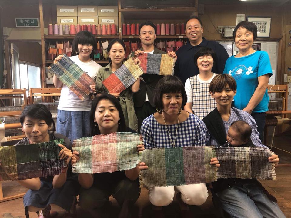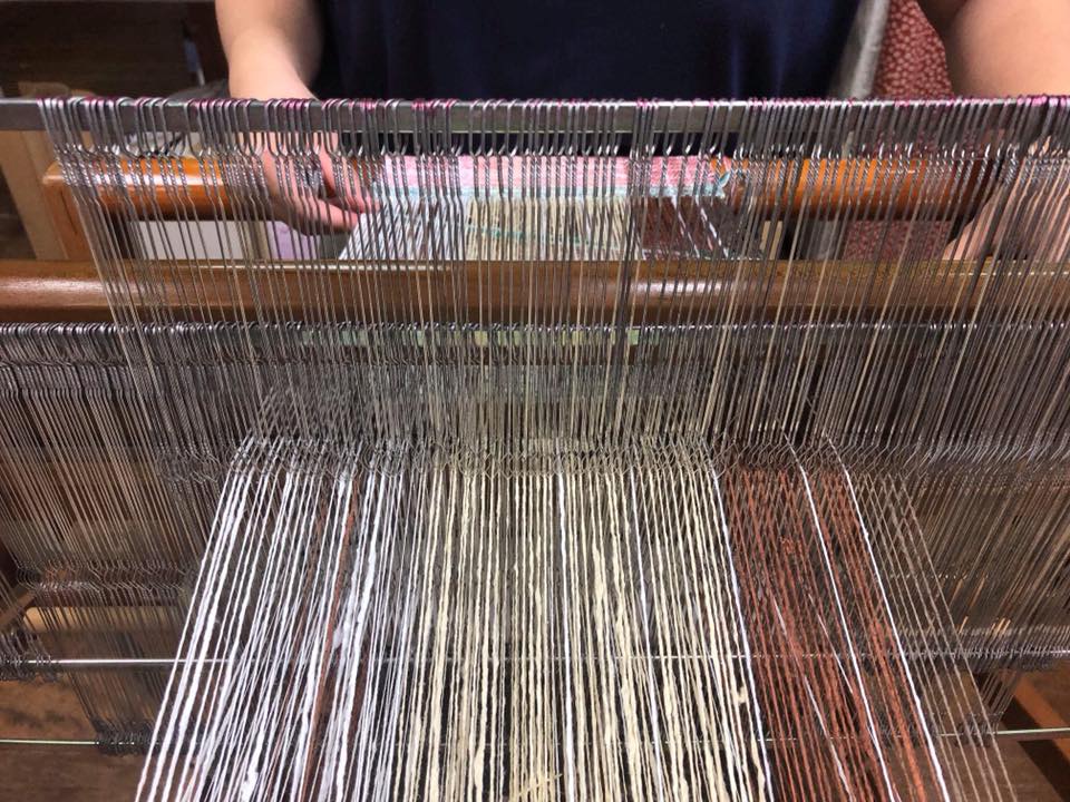 機織り機を使って、工場の授業員のお母さん達に教えてもらいながら、今回はテーブルクロスを織りました。自分の好きな糸と下地を選び、トントンと心地よい音ともに、機織りに集中しました。機織り初体験でしたが、とても楽しく、その時間に癒されました。