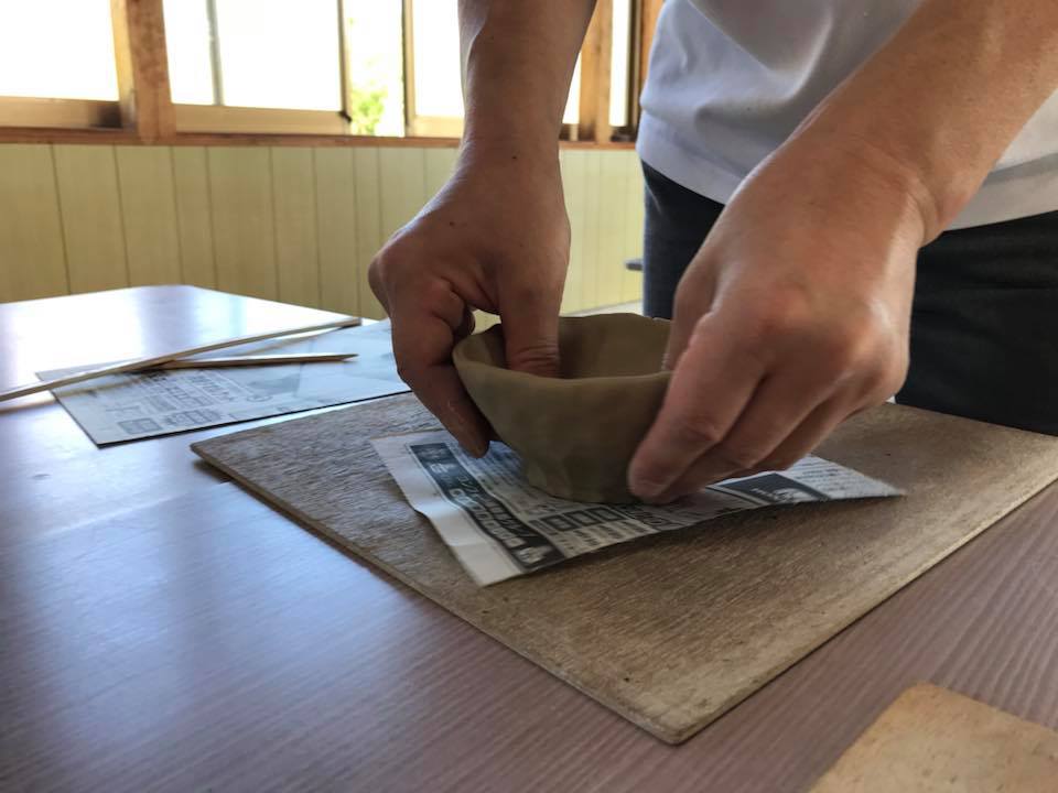作陶用の粘土を作るのかなどの工程の説明のあと、奥にある体験室で作陶しました。無心に粘土を捏ね、その後自分の作りたい、皿、マグカップ、などを手びねりで作ります。宮内さんの説明では簡単そうに作られていましたが、実際に作ると、思うような形にならず苦戦しました。でも、無心になって粘土を捏ねるということはとても楽しく、あっという間に時は流れました。