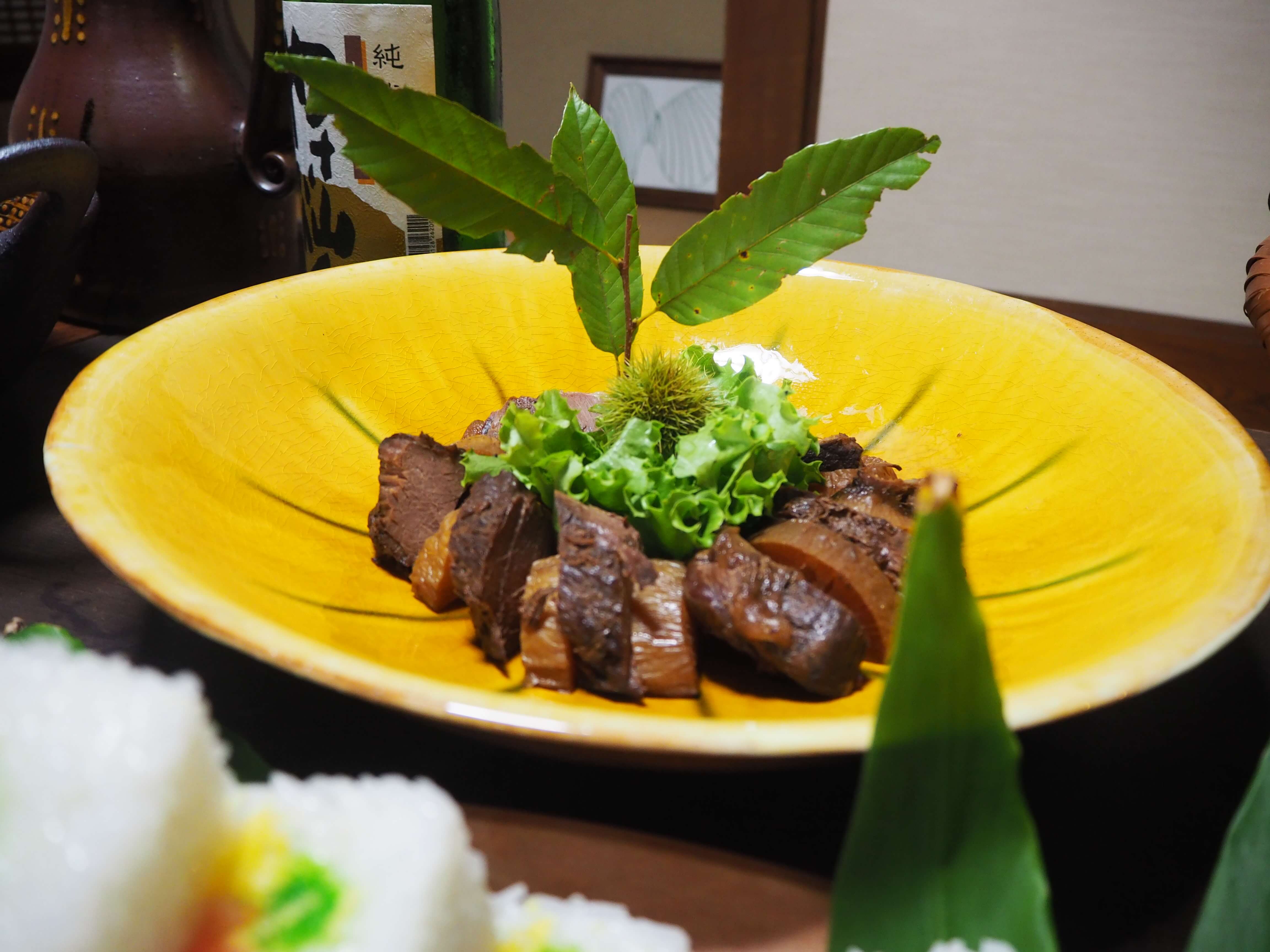 私は猪肉の煮物を盛り付けたのですが、何かもう1つ足りない・・・と思っていました、そのとき、飯野教授に栗の枝を添えていただき、みるみるうちに、とても魅力的なお皿になりました。