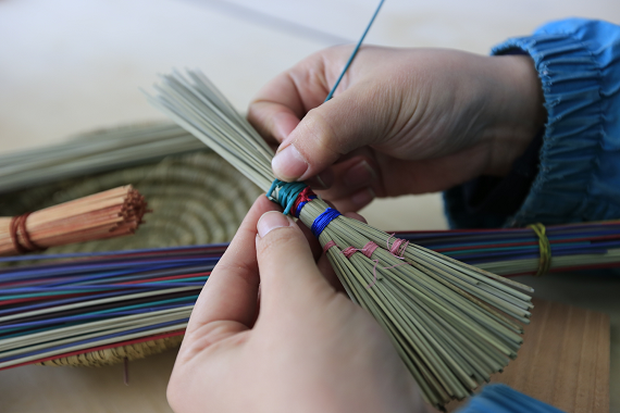 ほうきは、尾道の暮らしの中でも掃除用具として欠かせないものであり、また安産を願う縁起物でもあります。竹やほうき草で作るのが一般的ですが、いぐさ部ではもちろんい草をつかって、オリジナルほうきを作ります。机の上のほこりを落としたり、縁起物として飾ってみたりと、それぞれの用途をお楽しみください。
