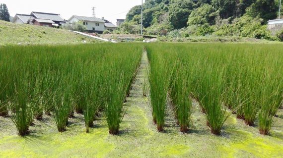 昔より尾道を含むこの備後地域は最高級の畳として名を馳せた“備後畳表”の産地です。その品質は幕府や朝廷に献上されていたほどでした。しかし、日本の暮らしの中で当たり前のように生活の一部であった畳も生活の変化によりニーズは減少しました。その備後畳表の価値を取り戻すために、2013年に“い草プロジェクト”は誕生しました。畳の素材である備後い草の価値を創出し、伝統産業の継承を理念に、い草の苗から栽培をスタート。絶滅に近い品種である「せとなみ」を活用し、昔から伝統を守り続けて来た畳表職人・門田さんを指導者にお招きし、地元の農業高校の生徒たちと一緒に栽培に取り組んでいます。
