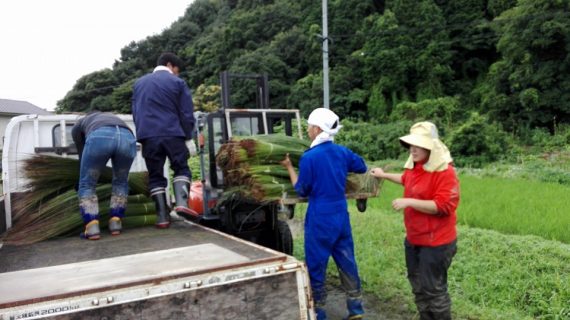 今回は、舞台は備後畳表の産地で知られる福山市熊野町。いぐさ部としては初の野外講義です。その熊野町にあるいぐさ部の田んぼで、実際に“い草の網掛け作業”を体験します。