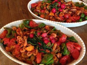 次々と出来上がる料理が、所狭しとテーブルに並べられていきます。赤、緑、黄色…旬の新鮮な食材を使った料理は、色もカラフルです。大きな葉っぱを敷いたり、生き生きした盛付も学びどころですね。およそ3時間でおよその目途がついたところで、休憩!