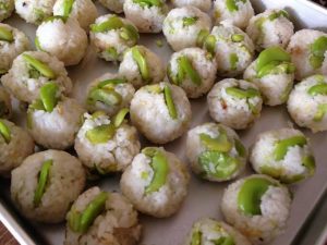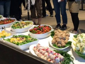 事前に長尾さんが用意くださったメニューのイラストを片手に、出来上がりを想像する受講生たち…。すでにおいしそうです。でも初めて作る大量の料理。おむすび班、サラダ班、ドレッシング班などに分かれ、限られた時間の中で一生けん命調理に励みます。調理しながら披露される長尾さんの料理ワンポイントレッスンは、日常の料理にすぐにでも取り入れられそうで、楽しく貴重な学び時間でした。