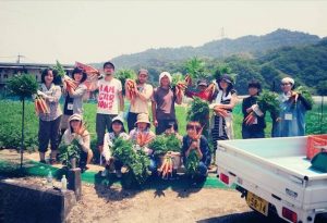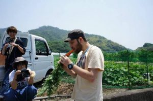 11時にキャンパスに集まった受講生たちは、一路向島へ。地元給食に野菜を収めている熊八屋さんの人参、大元さんのピーマンを収穫に伺いました。一面の人参畑を前に、2㎏収穫の予定が8㎏も収穫。青空のもとでの収穫はとても楽しかったようです。その場でかぶりついた人参もピーマンも甘く、ルーカス編集長をはじめみんな驚きの表情でした。