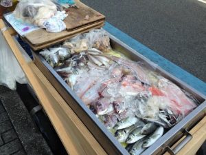 タイ、タコ、地エビ…キラキラ光る海鮮を目にした長尾さんは、料理のアイデアがむくむくと湧いてきたようです。