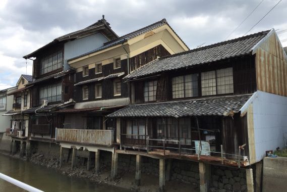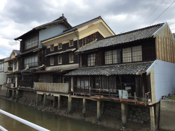 今も、羽原川沿いには小さなバルコニーのような建具が、ぐいっと川沿いにせり出すように取り付けられた建物が並んでいます。これは塩を直接運搬できるように、船が横付けできる仕様になっているのです。ここから塩を積んだ船は、川を下り松永湾に出でて、日本各地を目指しました。