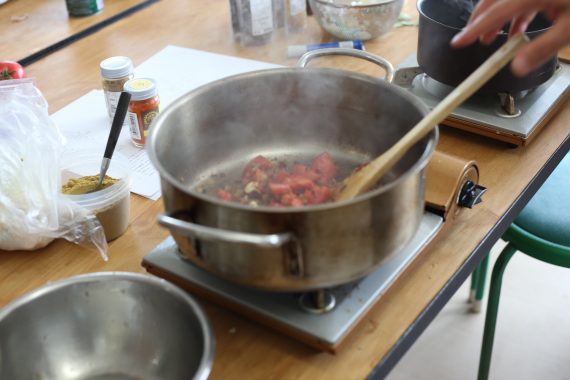 基本的なカレーの作り方から理論までを学び、季節の野菜や魚介類など旬の食材をスパイスでどう調理するか、話し合います。