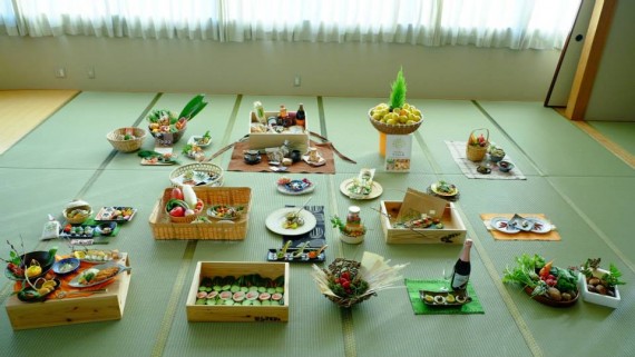 会場に戻り、盛り付けデザインスタートです。持ち時間は30分。受講生たちは、素材の魅力を様々な角度からとらえ直している様子。しばらく考え、大きなザルに世界を広げたり、色を活かすために切ったり重ねたり。これまで考えてもみなかった組み合わせを試した方も多かったようです。試行錯誤をしている時間はあっという間に過ぎ、今回も、広間の畳の上に作品を並べて講評です。それぞれのデザインしたプレートが集まり、世羅のテーブルが出来上がっていきます。