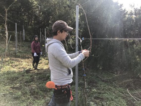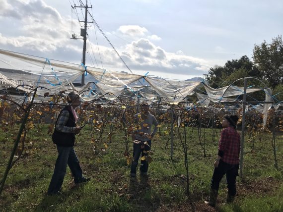 2日目も快晴の中スタートです。午前中は、川田教授の葡萄畑へ行きました。川田教授の育てている葡萄畑は、何度来ても癒されます。畑では、教授が育てている葡萄の種類と剪定作業を行いました。去年と比べて見上げるほど苗木が成長していました!島内外からも畑に訪れる方も多く教授が作る葡萄、そしてワインを皆さん楽しみにされているそうです。来年には、更に立派な葡萄畑になっているとのことで今から楽しみです。