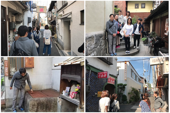 続いて、新開まち歩きへ。レトロな雰囲気の路地を巡ります。まだ明るかったということもあり、普段の飲みに来たときには見過ごしてしまうような、尾道の歴史を感じられるものが沢山残っていることがわかりました。