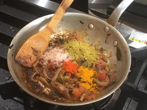午後からは、2種類のスパイスカレー鍋を作ります。チキンを使った、東インドのマスタードが効いたカレー鍋と尾道産のチヌを使った南インドのココナッツ風味のカレー鍋です。まずはスパイスカレーの基本と一緒、油、玉ねぎ、にんにくしょうが、トマト、スパイス、塩でカレーペーストを作成。この段階で、すでに両者の香りには違いがあります。それぞれのペーストを鍋に移し、まずは水やスープで伸ばしてそのまま第一弾。次は、チキンの鍋にはチャツネを加え、魚の鍋にはココナツミルクを入れて第二弾。最後、魚の鍋にはレモングラスとミントを!すると不思議、南インドの風味から、東南アジアの風味に進化しました。