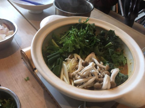 加える野菜も、今回はケールや高菜、からし菜、ブロッコリー、菜の花など、普段の鍋とは一味違うものを入れてみました。これが不思議、癖のある野菜もスルスルと食べられました。「鍋とカレーは、寛容だからね」とバラッツさん。ハッとしました。これほど寛容な組み合わせはないですね!何を入れても美味しくなります。