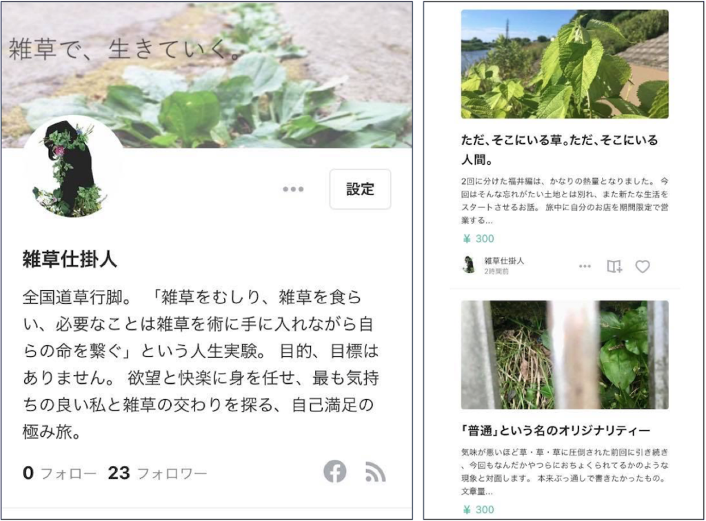 旅の間の生存報告のツールとして記事がアップされていたnote『雑草で、生きていく。』には、「目的、目標はありません。欲望と快楽に身を任せ、最も気持ちの良い私と雑草の交わりを探る、自己満足の極み旅。」という口上と共に、日本全国の雑草たちと戯れる(弄ばれる?)旅の様子が綴られていました。(現在も未完で絶賛更新中)